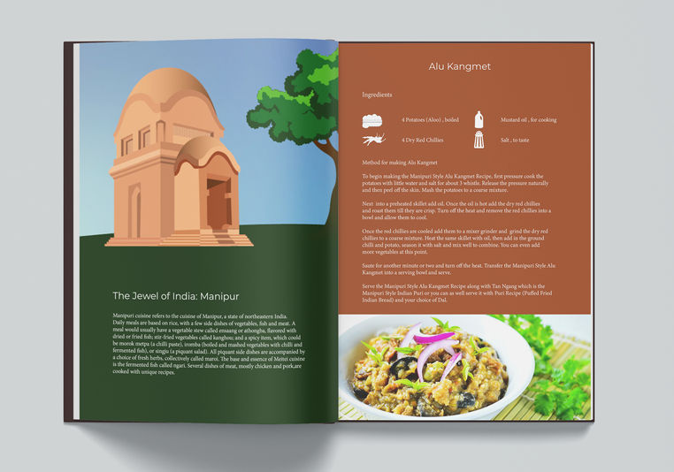 I designed a print that captures the essence of Indian cuisine, immersing every page in our rich cultural heritage. I curated a collection of 30 unique cuisines from various regions, with my own illustrations and mouthwatering recipes from different chefs.